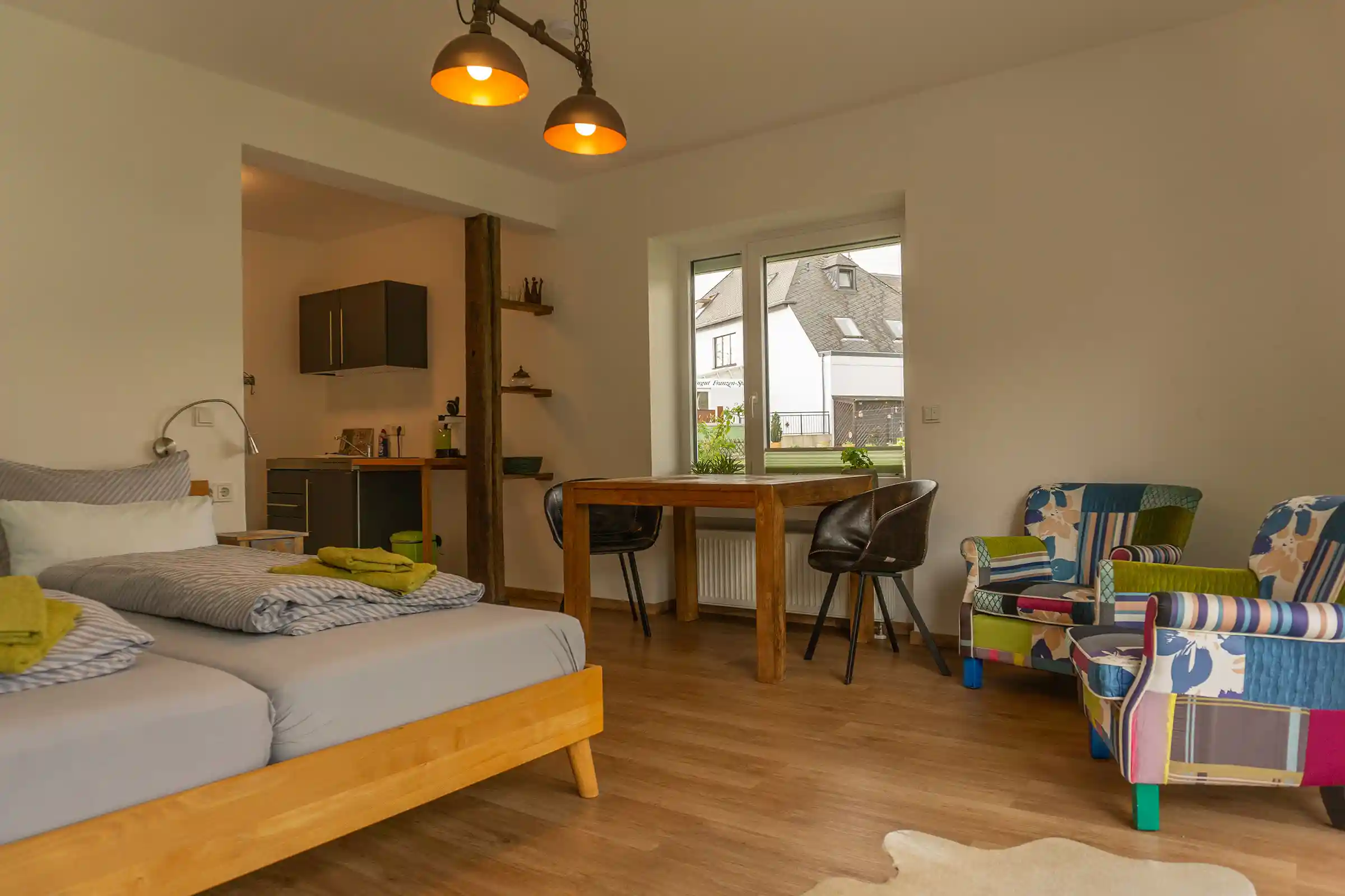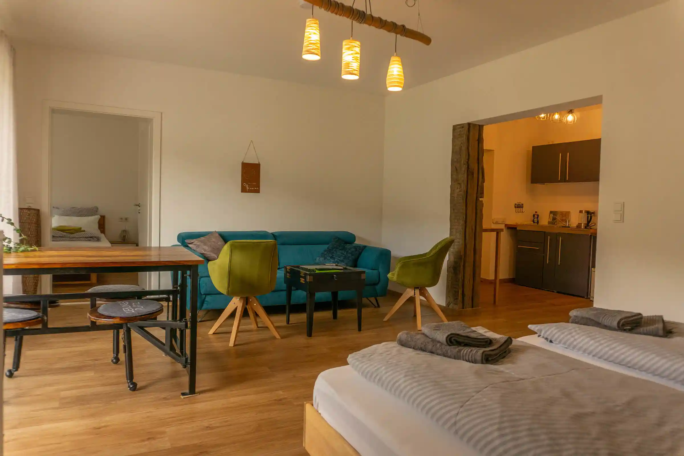 Alle Apartments verfügen über einen gemütlichen Wohn-/Schlafraum (incl. Mini-Küche mit Ceran-Kochfeld, Kühlschrank, Spüle, Kaffeemaschine, Wasserkocher und Toaster) sowie über ein Bad mit Wellness-Dusche. Zwei Apartments haben jeweils ein zusätzliches Schlafzimmer.